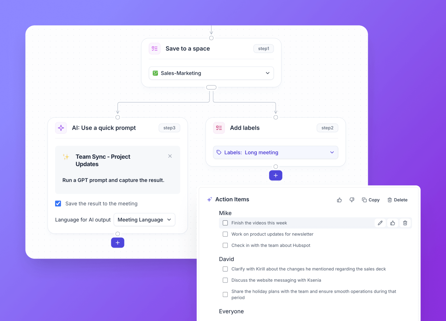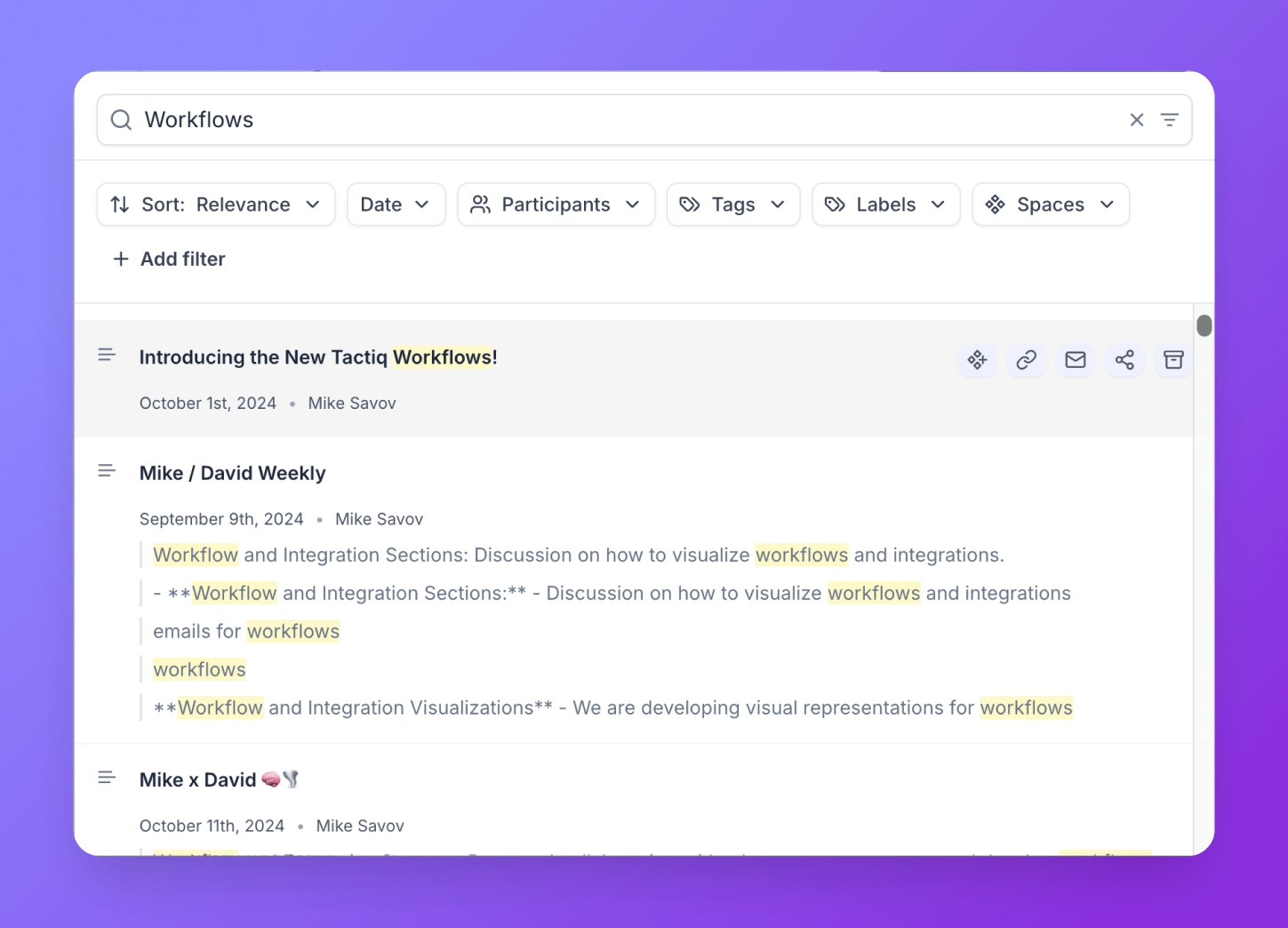 Action Items & Summaries: Search through summaries, project updates, and action items created with Tactiq’s custom prompts.