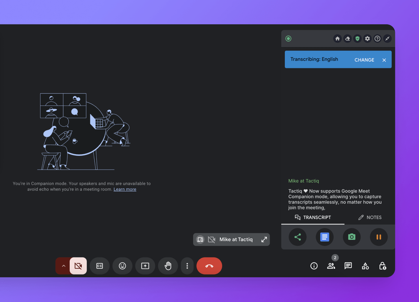 Good news for Google Meet users! Tactiq is now compatible with Google Meet Companion Mode, a fantastic setup for learning and collaborative environments. With this update, you can transcribe live meetings even when joining without video or audio, allowing you to capture essential insights without needing a full setup.