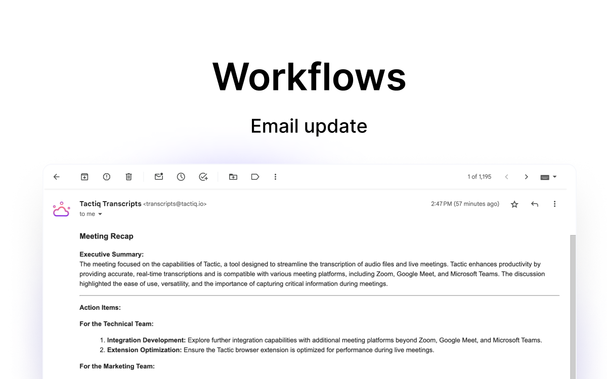 We’ve upgraded the look of emails generated by Tactiq’s Workflows to match the clean, organized styling of your meeting insights. 💌